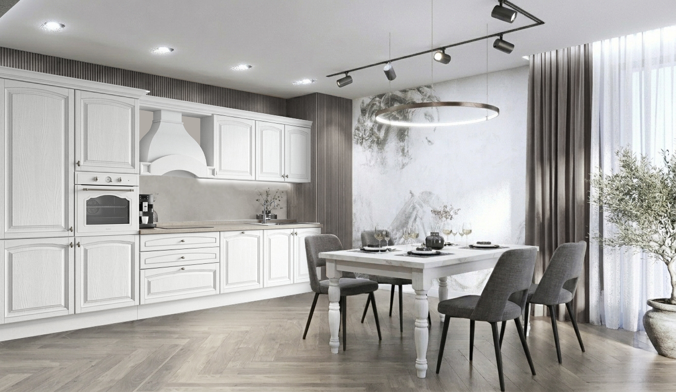 1. Bucatarie L 360cm complet utilată (chiuveta, baterie, cuptor, plita, mașina de spălat vase, hota, combina frigorifica)